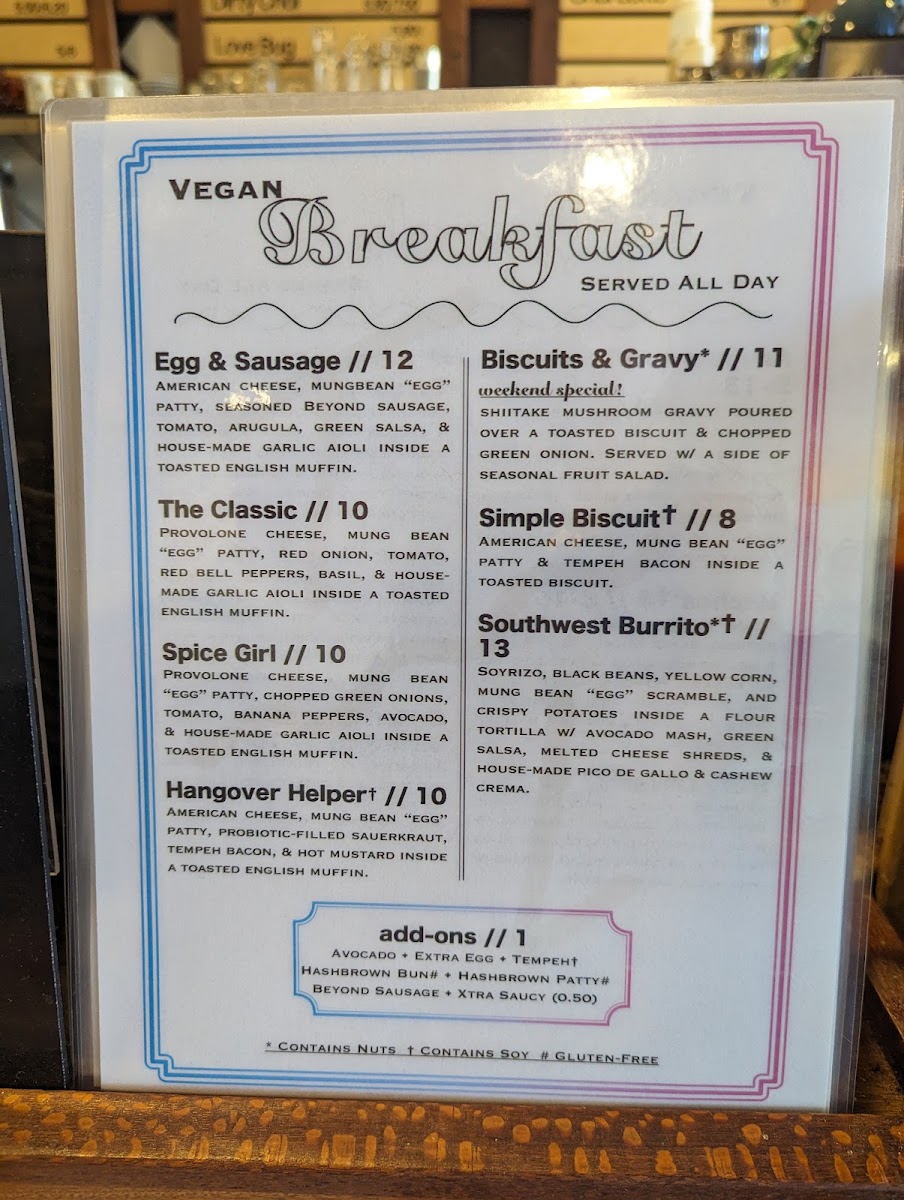 Start your day with the Southwest Burrito, packed with a vibrant mix of soyrizo, black beans, and a delightful mung bean “egg” scramble, all wrapped in a warm flour tortilla and topped with refreshing housemade pico de gallo and cashew crema. For those looking for a lighter fare, the Herbal Shiitake Mushroom Gravy drizzled over a homemade biscuit is a must-try, especially when paired with a side of seasonal fruit salad—it’s comfort food redefined!